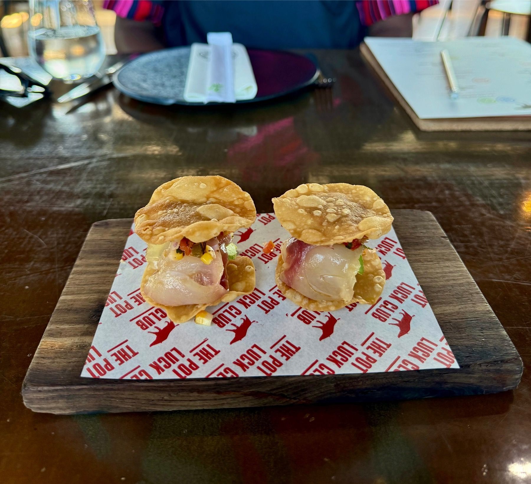 To my delight, it was time for our first course. These two perfectly golden and generously filled “tacos” were placed between us. They were even more beautiful than the photos I had obsessively stalked online.